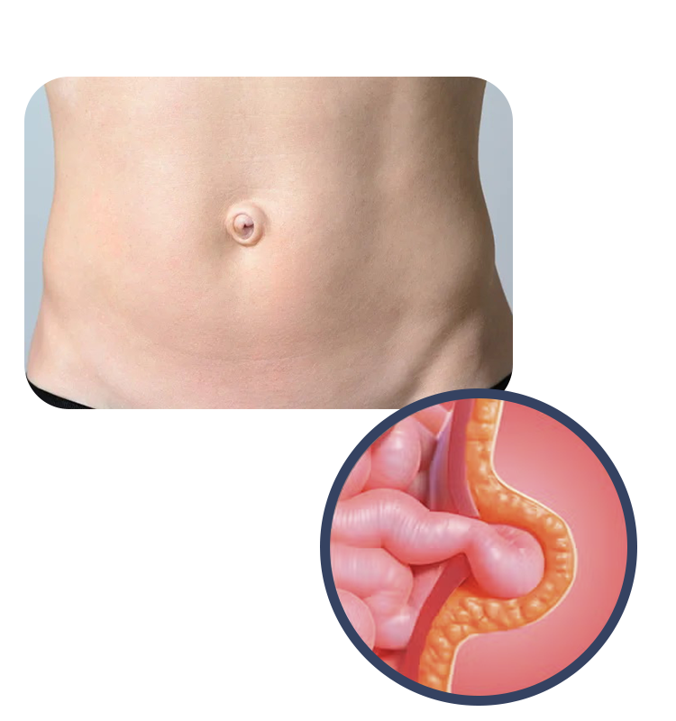 Una hernia umbilical se produce cuando la fascia de la pared abdominal que se encuentra en el ombligo se desgarra o rompe, ocasionando la protrusión de los órganos del abdomen a través de ese orificio. Las hernias umbilicales son frecuentes y en algunos casos son inofensivas.